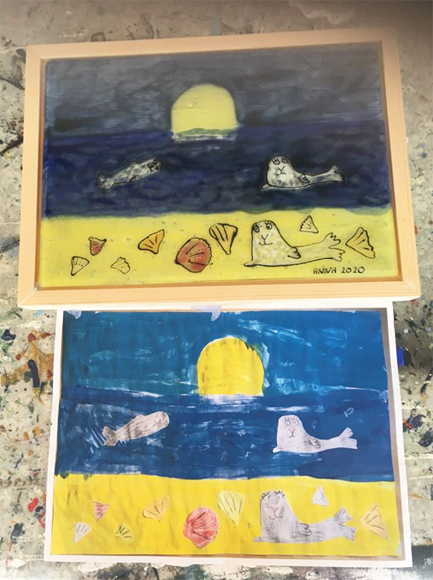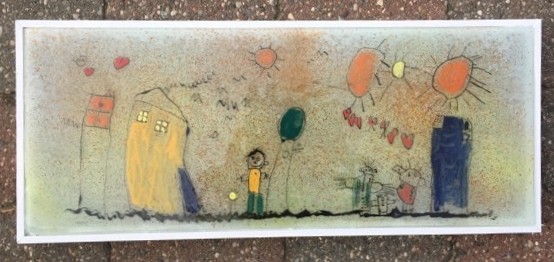 Min 4-årige søn's tegninger overført til indrammet glasbillede 23 x 58 cm.