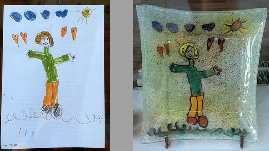 Tegning lavet af min 4-årige datter overført til glasfad 23 x 27 cm.